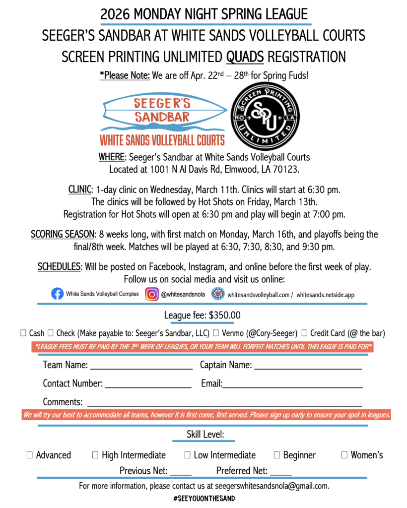 The 2026 Seeger’s Sandbar at WSVC SPRING LEAGUE will be held at