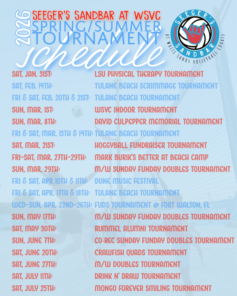 To register for tournaments, please use the links below or email us at seegerswhitesandsnola@gmail.com